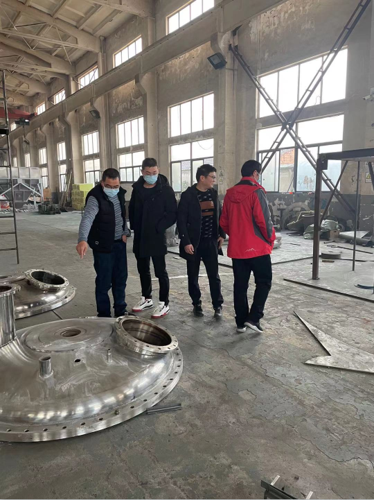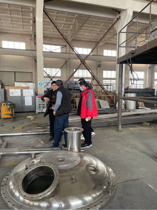 近日我司老客戶浙江某上市公司一行人,在查總的陪同下參觀了生產車間,針對性的了解了我司zhuanli產品單錐螺帶真空干燥機及細節處理。