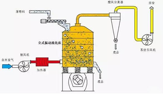 由安裝于主機(jī)下部的兩個(gè)振動(dòng)電機(jī)同步反向回轉(zhuǎn),使安裝于其上的多層環(huán)狀孔板組成的主機(jī)產(chǎn)生垂直振動(dòng)與扭振,從而使由進(jìn)料口進(jìn)入的物料沿水平環(huán)狀孔板自上層向下層連續(xù)跳躍運(yùn)動(dòng)。熱空氣則自下層向上層通過各層孔板穿過物料層,達(dá)到物料均勻干燥目的。