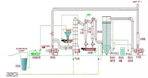 空氣加熱到300℃,然后進(jìn)人圓柱型流化床內(nèi),使預(yù)先裝入的φ1-2mm的玻璃球流化。然后將料漿由齒輪泵由拌漿槽打出,借氣流式噴嘴噴入玻璃珠流化床內(nèi),物料在玻璃珠相互球磨作用下,迅速使產(chǎn)品粉碎及干燥,達(dá)到320目細(xì)度。干燥后的產(chǎn)品隨氣流從流化床頂逸出,經(jīng)二級(jí)高效旋風(fēng)分離器分離后,再經(jīng)文丘里管濕法除塵,最后經(jīng)旋風(fēng)分離器使氣液分離,尾氣排入大氣。